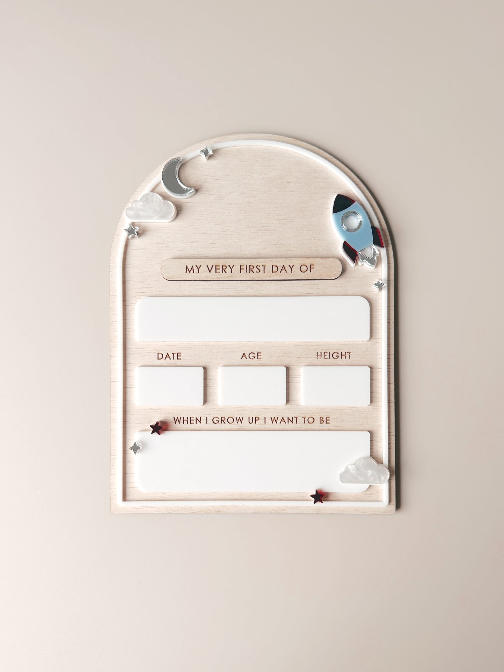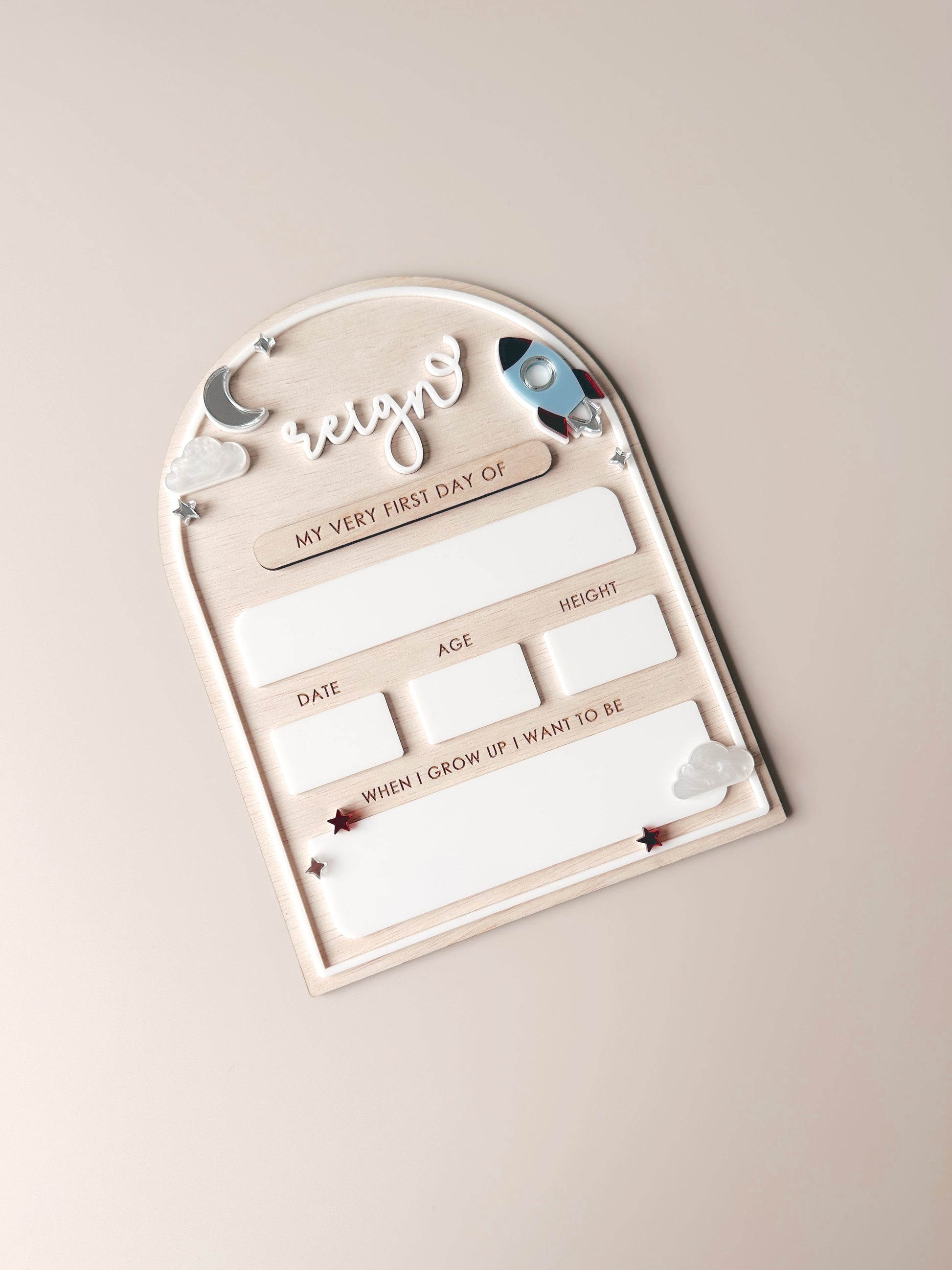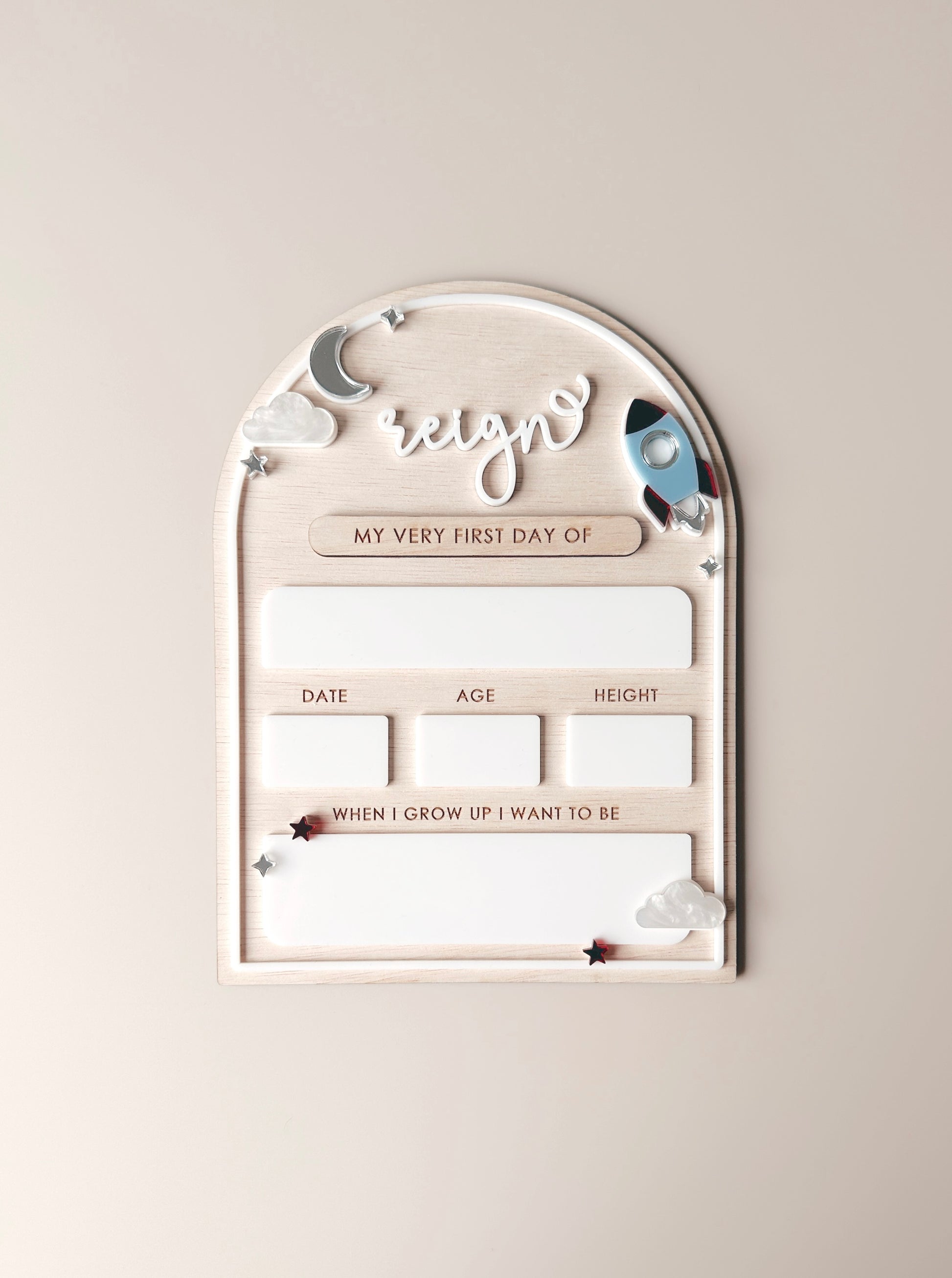 A fun back-to-school wooden plaque featuring a playful rocket, ready for blast off into a new school year. Made from natural wood, it’s a sweet way to capture those first-day moments and celebrate all the learning and adventures ahead. A simple keepsake for little space lovers with big dreams. 🚀
